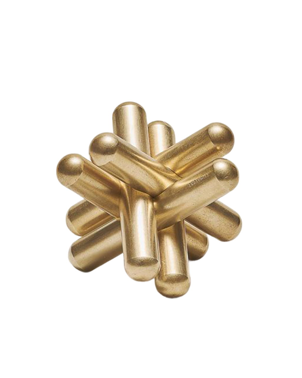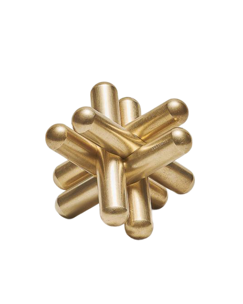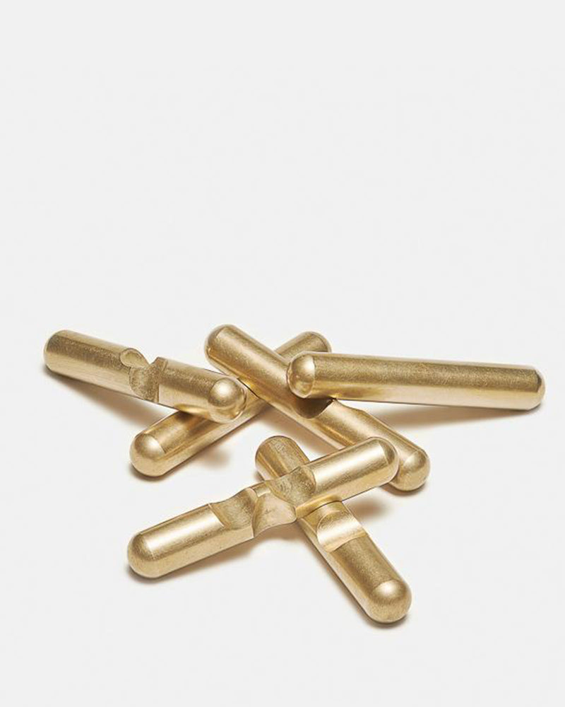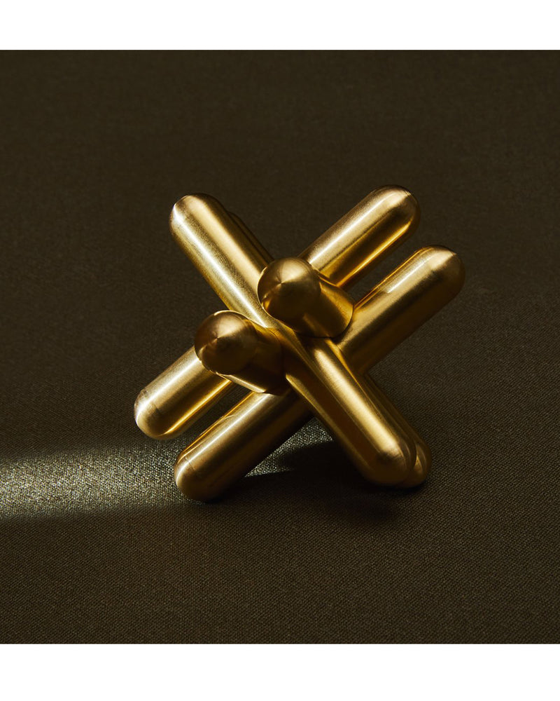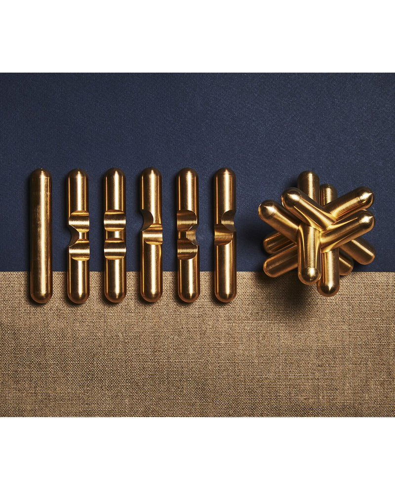 The Jack Puzzle is comprised of six different notched brass bars that interlock in one specific way to create a unified "jack" shape.